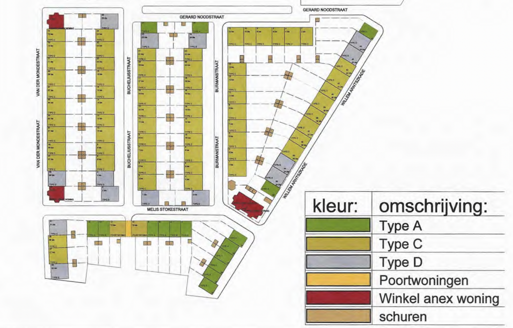 type D: beneden- en een bovenwoning met als kenmerkende eigenschap een erker aan de achtergevel. In deze woningen waren de voorkamer en de woonkamer niet meer naast elkaar geplaatst. Bovendien heeft de benedenwoning een extra slaapkamer op de eerste verdieping, dus naast de bovenwoning.