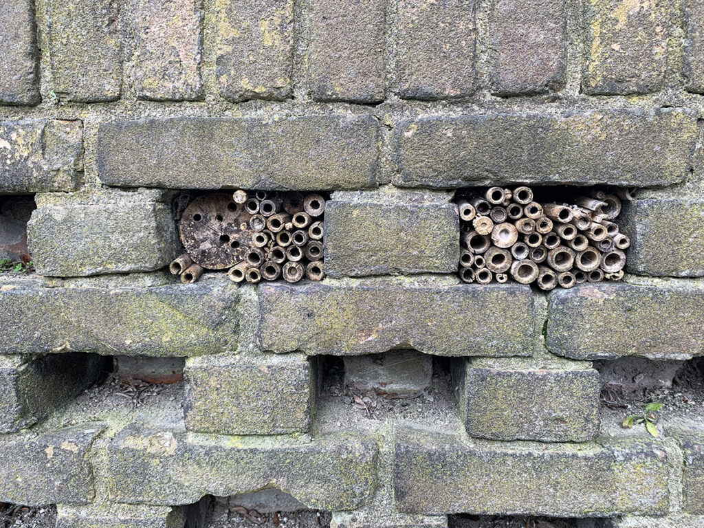 Uitbreiding van het overvolle bijenhotel in het muurtje aan de Melis Stokestraat.