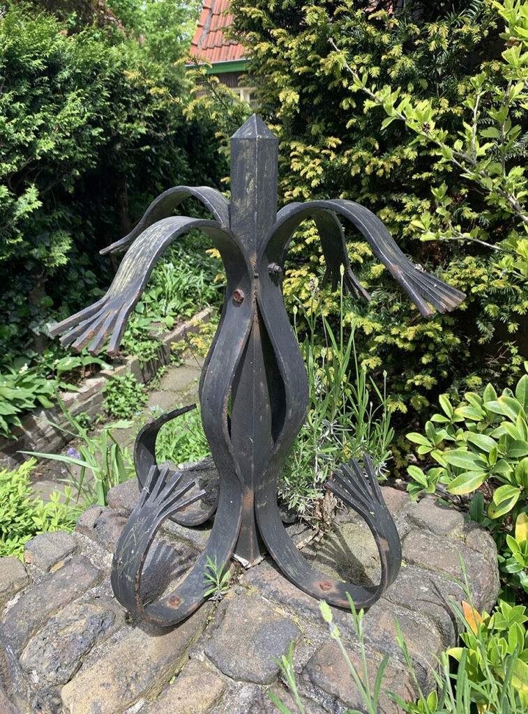Onder; waar destijds het smeedwerk zat, de voormalige bakkerij op de Melis Stokestraat, zit nu op de bakstenen paal nog smeedwerk. Mogelijk als afgeleide of rest van eerder smeedwerk.